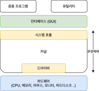 운영체제의 구조는 인터페이스, System Call, 커널, 드라이버로 구성되어 있다.